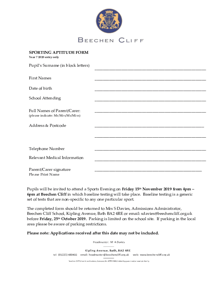 SPORTING APTITUDE FORM Year 7 2020 entry onlyPupils Surname (in block letters) First Names Date of birth School Attending Full Names of Parent/Carer: (please indicate: Mr/Mrs/Ms/Miss)Address & Postcode