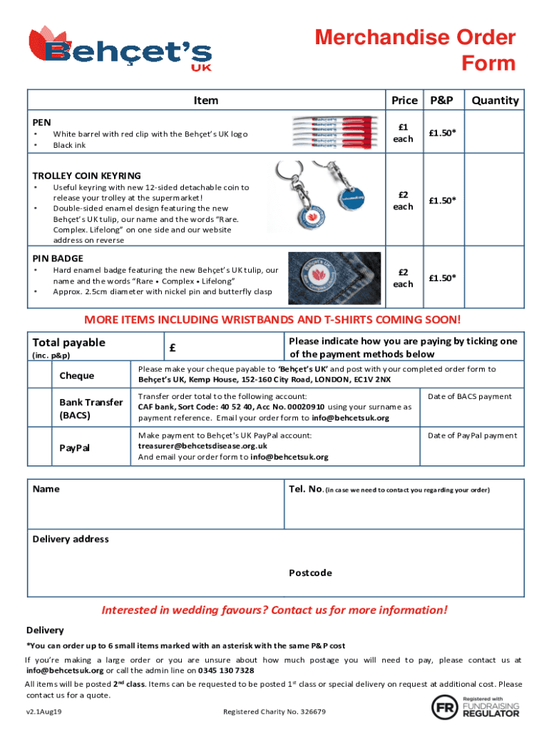Merchandise Order Form Item Price HAPPEN White barrel with red clip with the Behest UK logo Black ink1 each1.50×2 each1.50×2 each1.50×QuantityTROLLEY COIN KEYING Useful caring with new 12sided