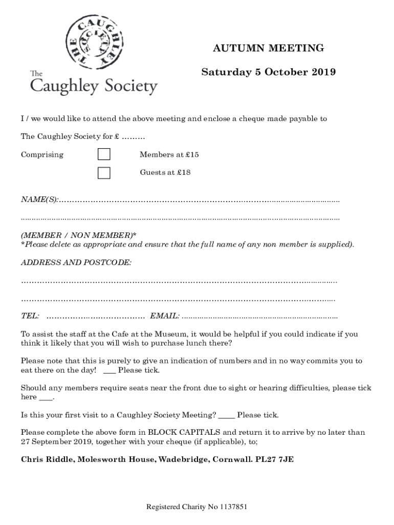 AUTUMN MEETING Saturday 5 October 2019I / we would like to attend the above meeting and enclose a check made payable to The Daughter Society for ComprisingMembers at 15 Guests at 18NAME(S):..................................