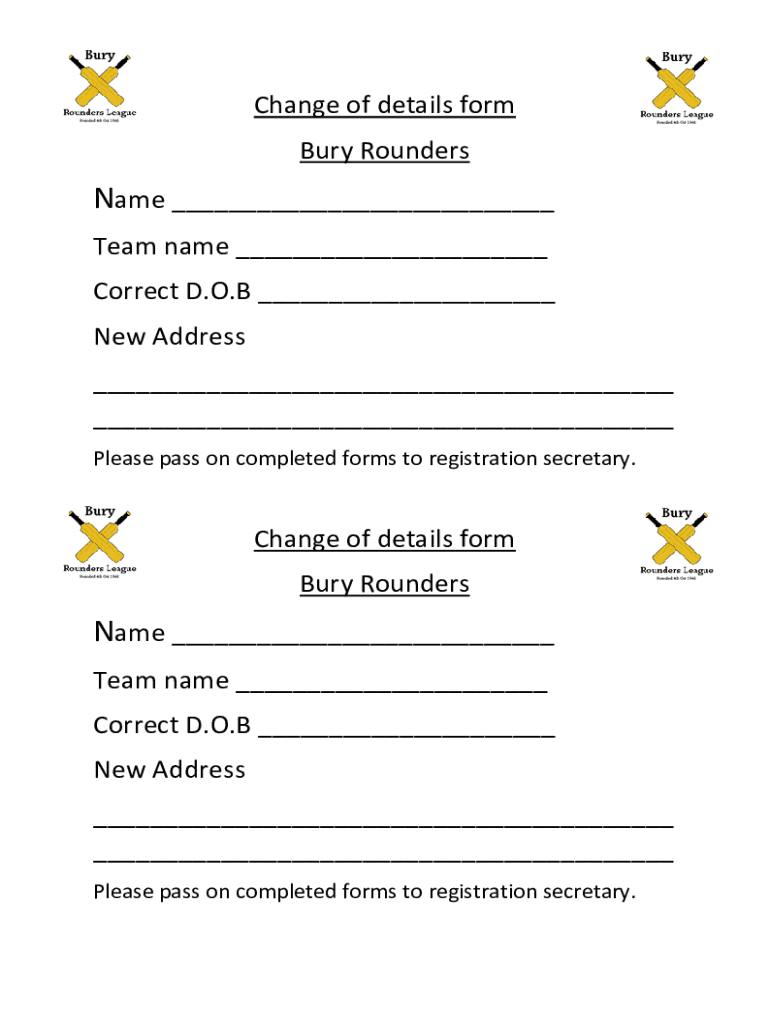 Change of details form Bury RoundersName Team name Correct D.O.B New Address Please pass on completed forms to registration secretary. Change of details form Bury RoundersName Team name Correct D.O.B