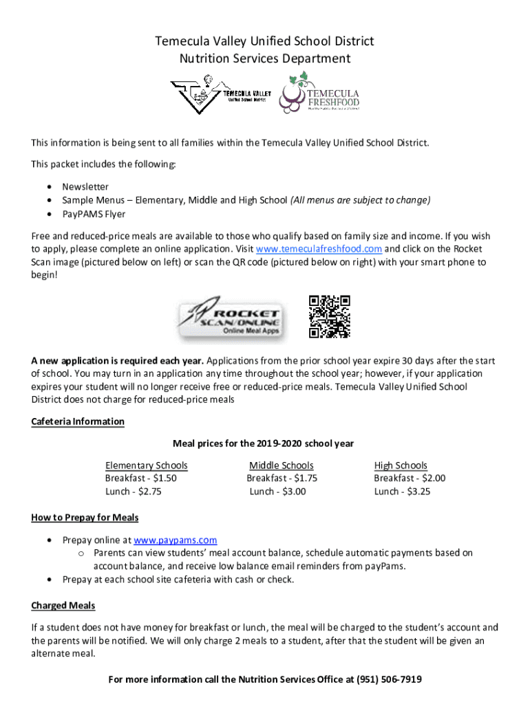 Temecula Valley Unified School District Nutrition Services Departments information is being sent to all families within the Temecula Valley Unified School District. This packet includes the following: