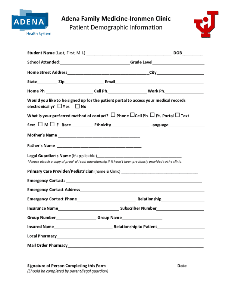 Arena Family MedicineIronmen Clinic Patient Demographic InformationStudent Name (Last, First, M.I.) DOB School Attended: Grade Level Home Street Address City State Zip Email Home pH. Cell pH. Work