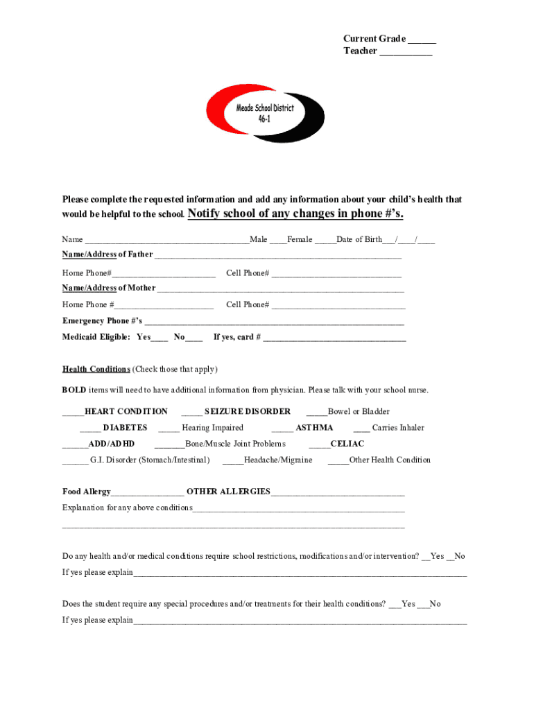 Current Grade Teacher Please complete the requested information and add any information about your children health that would be helpful to the school. Notify school of any changes in phone #s. Name