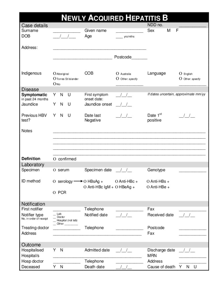 NEWLY ACQUIRED HEPATITIS B ADD no. Sex Case details Surname DOB / / Given name Age yrs/misaddress: F Postcode Indigenous Aboriginal Torres St Islander No COB Australia Other: specify LanguageYNUFirst