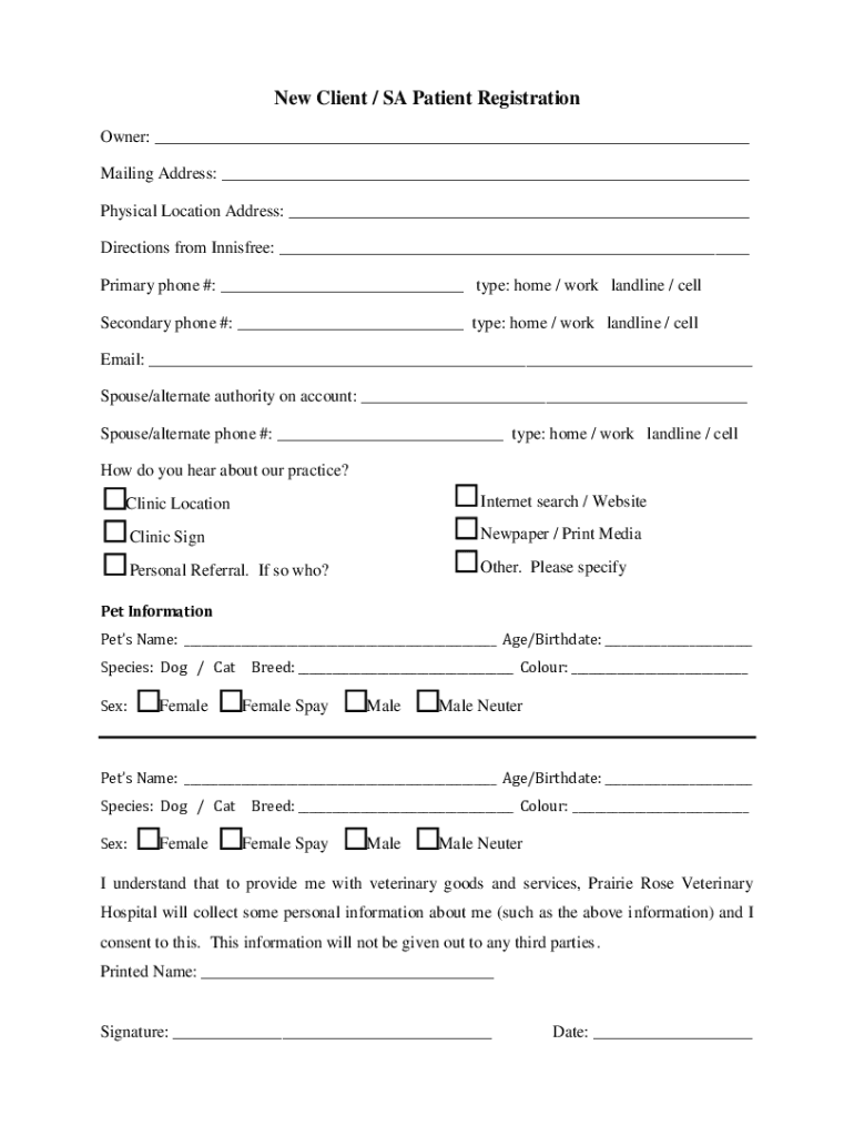 New Client / SA Patient Registration Owner: Mailing Address: Physical Location Address: Directions from Innisfree: Primary phone #: type: home / work landline / cell Secondary phone #: type: home