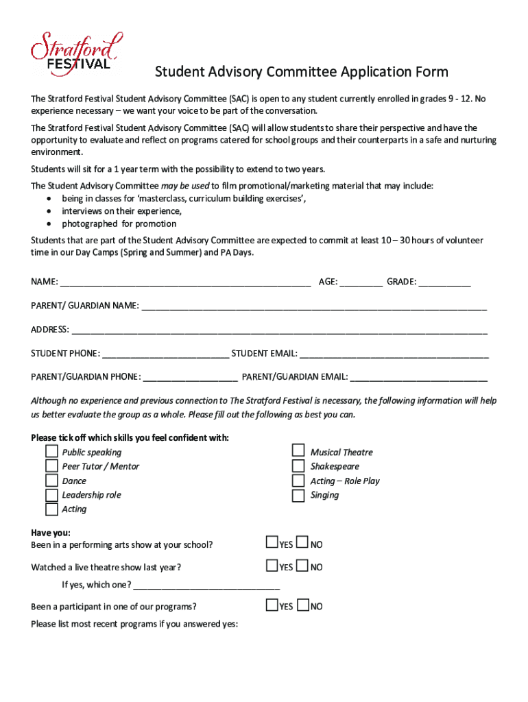 Student Advisory Committee Application Form The Stratford Festival Student Advisory Committee (SAC) is open to any student currently enrolled in grades 9 12. No experience necessary we want your voice