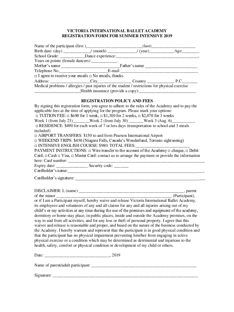 VICTORIA INTERNATIONAL BALLET ACADEMY REGISTRATION FORM FOR SUMMER INTENSIVE 2019 Name of the participant (first) (last) Birth date: (day) / (month) / (year) Age: School Grade: Dance experience:,