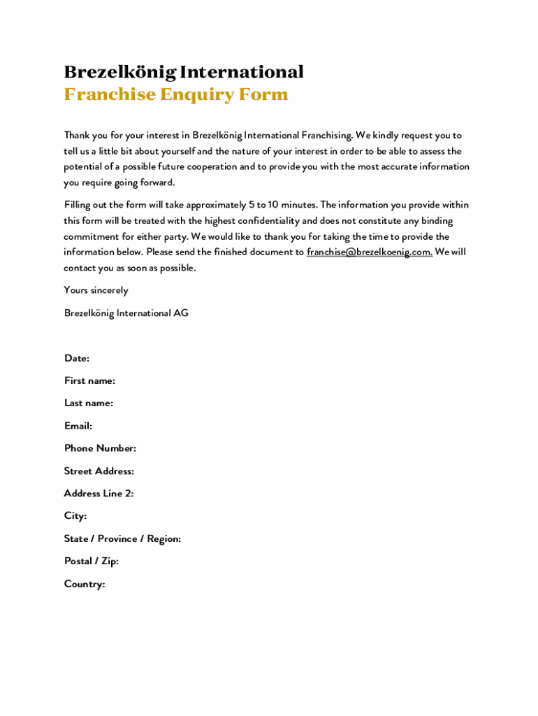 To fill out the brezelknig international franchise enquiry, applicants should complete the provided form with accurate personal and financial information, along with any specific questions they may have about the franchise.