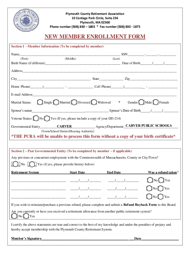 Plymouth County Retirement Association 10 Cordage Park Circle, Suite 234 Plymouth, MA 02360 Phone number (508) 830 1803 * Fax number (508) 830 1875NEW MEMBER ENROLLMENT FORM Section 1 Member Information