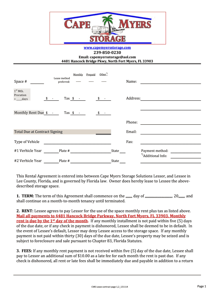 WWW.capemyersstorage.com 2398500230 Email: capemyersstorage aol.com 4481 Hancock Bridge Pkwy, North Fort Myers, FL 33903 Monthly Space # 1st MTV. Proration days Prepaid Other*) Lease method preferred: