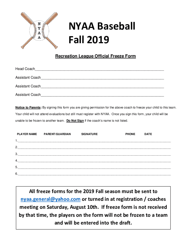 NCAA Baseball Fall 2019 Recreation League Official Freeze Form Head Coach Assistant Coach Notice to Parents: By signing this form you are giving permission for the above coach to freeze your child