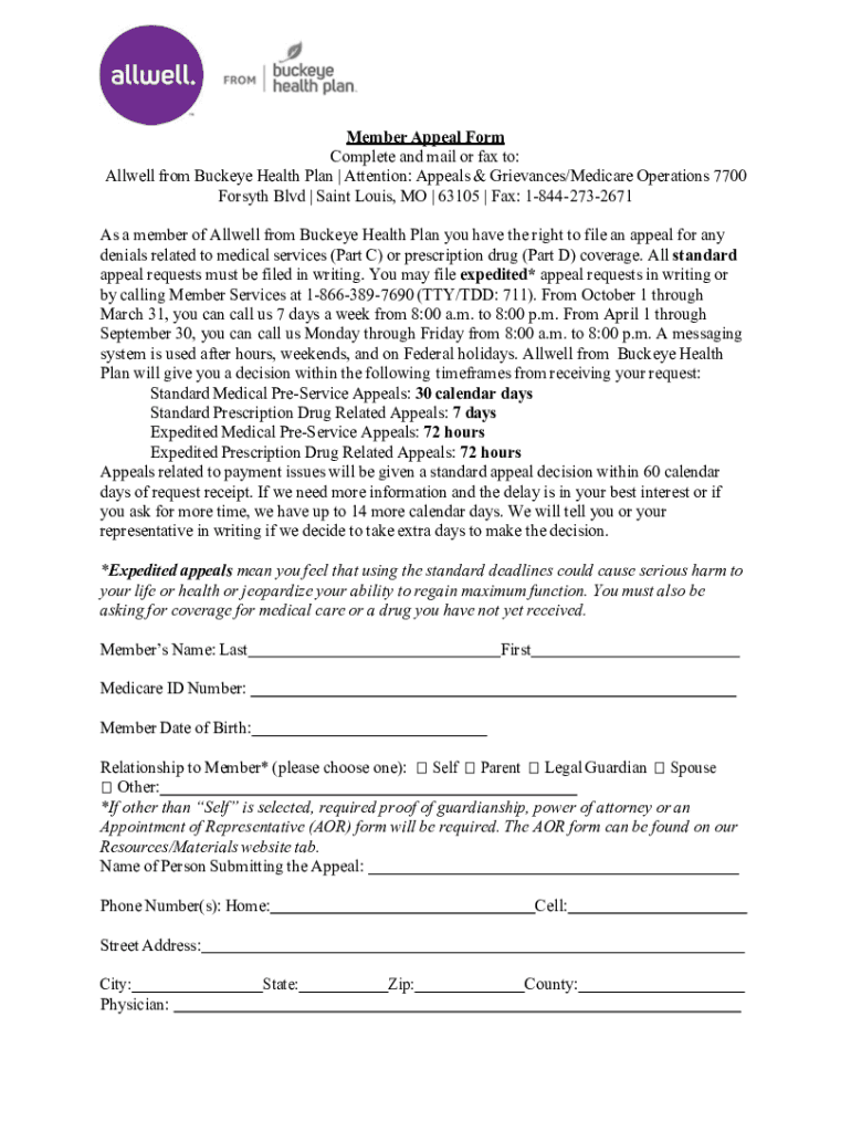 Member Appeal Form Complete and mail or fax to: All well from Buckeye Health Plan Attention: Appeals & Grievances/Medicare Operations 7700 Forsyth Blvd Saint Louis, MO 63105 Fax: 18442732671 As a