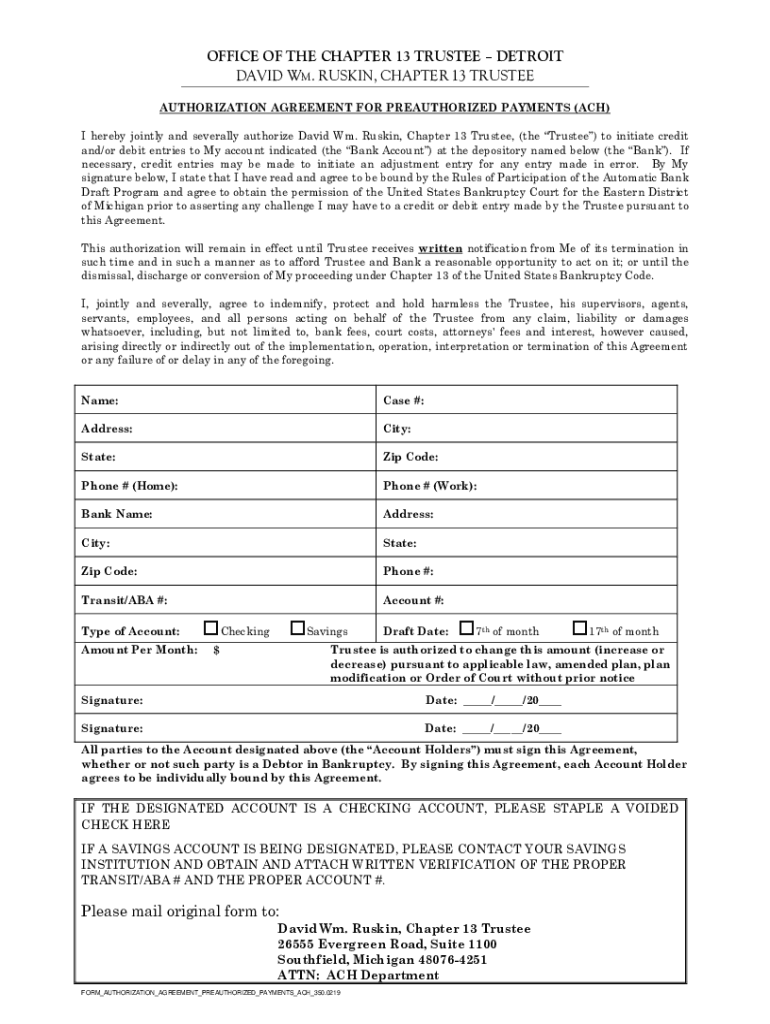 OFFICE OF THE CHAPTER 13 TRUSTEE DETROIT DAVID WM. RUSKIN, CHAPTER 13 TRUSTEE AUTHORIZATION AGREEMENT FOR PREAUTHORIZED PAYMENTS (ACH) I hereby jointly and severally authorize David Wm. Ruskin, Chapter