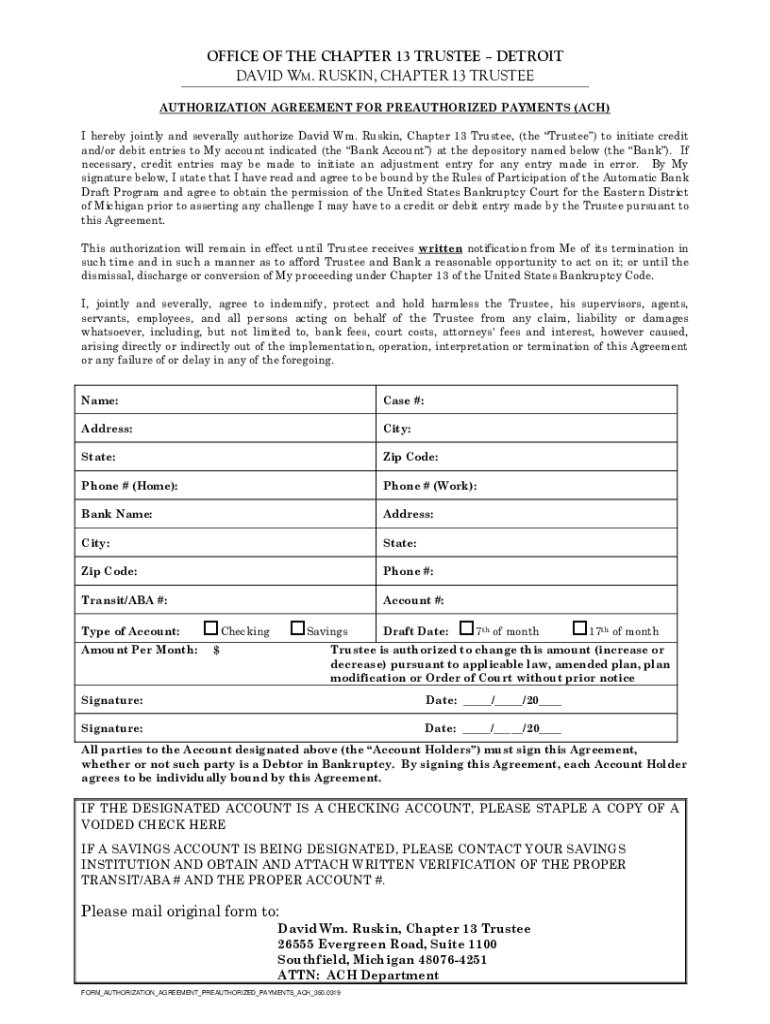OFFICE OF THE CHAPTER 13 TRUSTEE DETROIT DAVID WM. RUSKIN, CHAPTER 13 TRUSTEE AUTHORIZATION AGREEMENT FOR PREAUTHORIZED PAYMENTS (ACH) I hereby jointly and severally authorize David Wm. Ruskin, Chapter