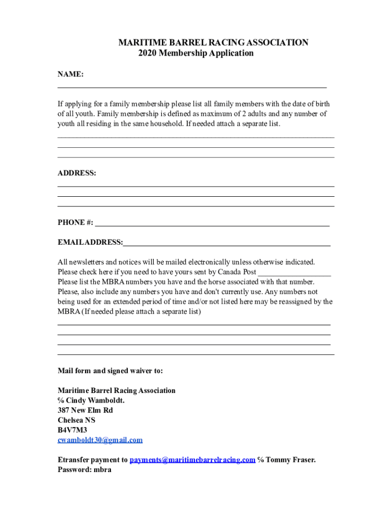 MARITIME BARREL RACING ASSOCIATION 2020 Membership Application NAME: If applying for a family membership please list all family members with the date of birth of all youth. Family membership is defined