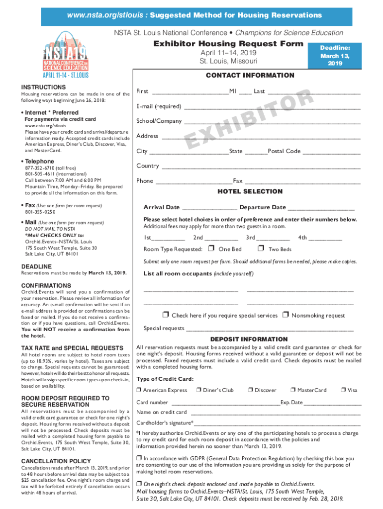 Www.nsta.org/stlouis : Suggested Method for Housing Reservations NSA St. Louis National Conference Champions for Science EducationExhibitor Housing Request Form April 1114, 2019 St. Louis, MissouriDeadline: