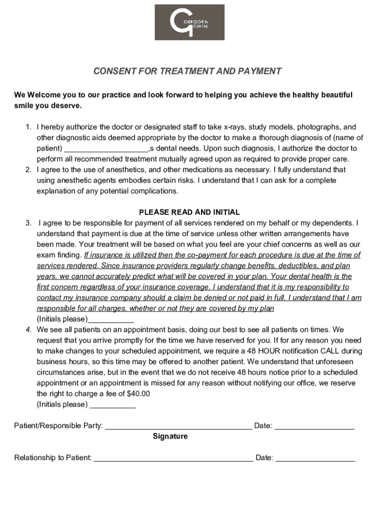 CONSENT FOR TREATMENT AND PAYMENT We Welcome you to our practice and look forward to helping you achieve the healthy beautiful smile you deserve. 1. I hereby authorize the doctor or designated staff