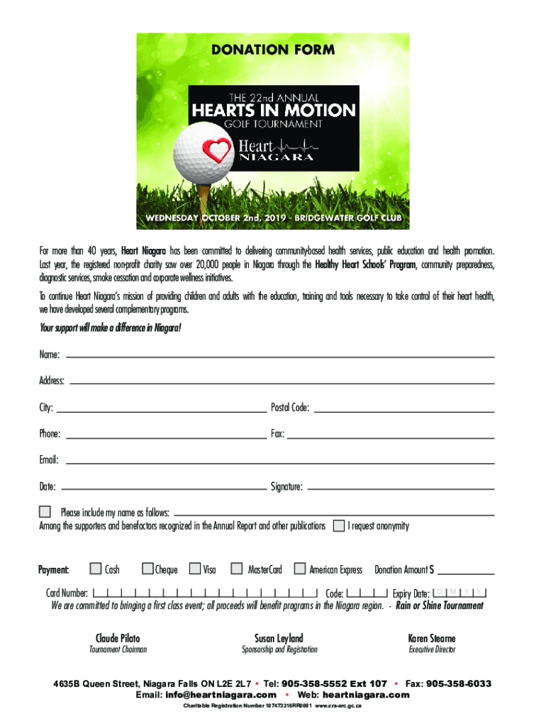 DONATION Former more than 40 years, Heart Niagara has been committed to delivering community based health services, public education and health promotion.
