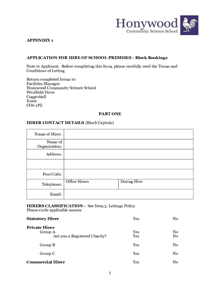 APPENDIX 1APPLICATION FOR HIRE OF SCHOOL PREMISES Block Bookings Note to Applicant: Before completing this form, please carefully read the Terms and Conditions of Letting Return completed forms to: