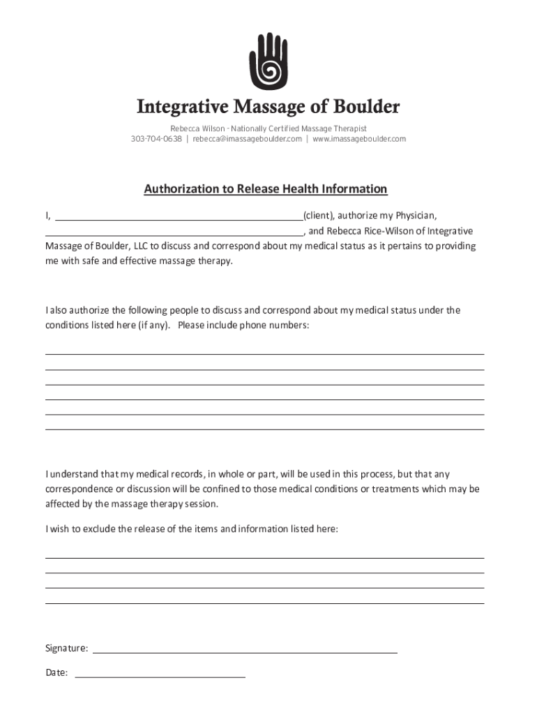 Rebecca Wilson Nationally Certified Massage Therapist 3037040638 Rebecca imassageboulder.com www.imassageboulder.com AuthorizationtoReleaseHealthInformation I, (client), authorizemyPhysician, andRebeccaRiceWilsonofIntegrative