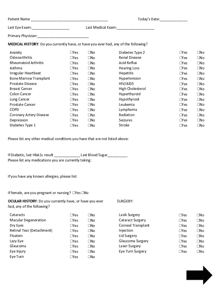 Patient Name Last Eye Exam: Today's Date: Last Medical Exam: Primary Physician: MEDICAL HISTORY: Do you currently have, or have you ever had, any of the following? Anxiety Osteoarthritis Rheumatoid