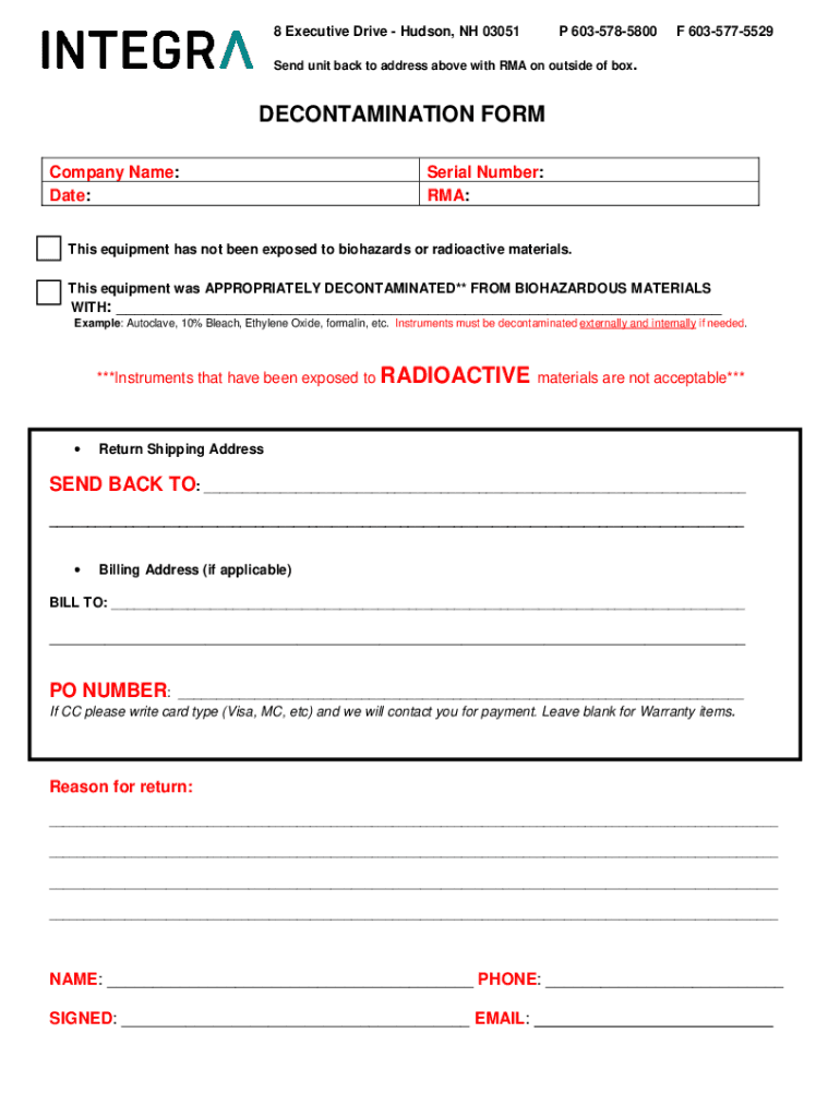 8 Executive Drive Hudson, NH 03051P 6035785800F 6035775529Send unit back to address above with RMA on outside of box. DECONTAMINATION FORM Company Name: Date:Serial Number: RMA:This equipment has
