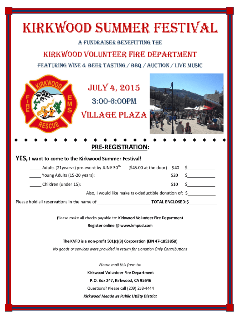 Kirkwood Summer Festival A fundraiser benefitting Kirkwood volunteer fire department Featuring Wine & Beer Tasting / BBQ / Auction / Live Music July 4, 2015 3:006:00pmVillage PlazaPREREGISTRATION:YES,
