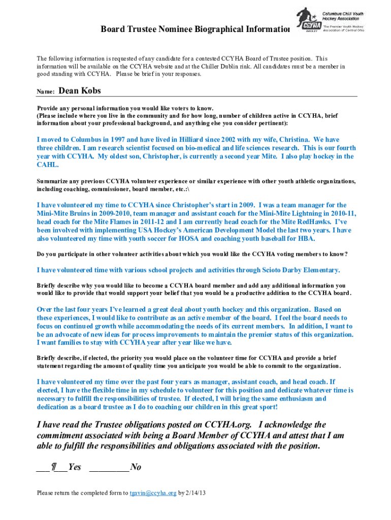The following information is requested of any candidate for a contested CC YHA Board of Trustee position. This