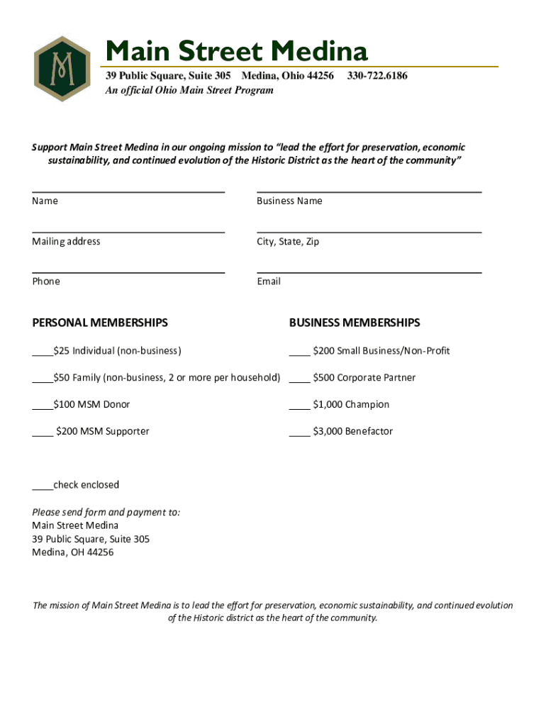 Main Street Medina 39 Public Square, Suite 305 Medina, Ohio 44256 An official Ohio Main Street Program330722.6186Support Main Street Medina in our ongoing mission to lead the effort for preservation,