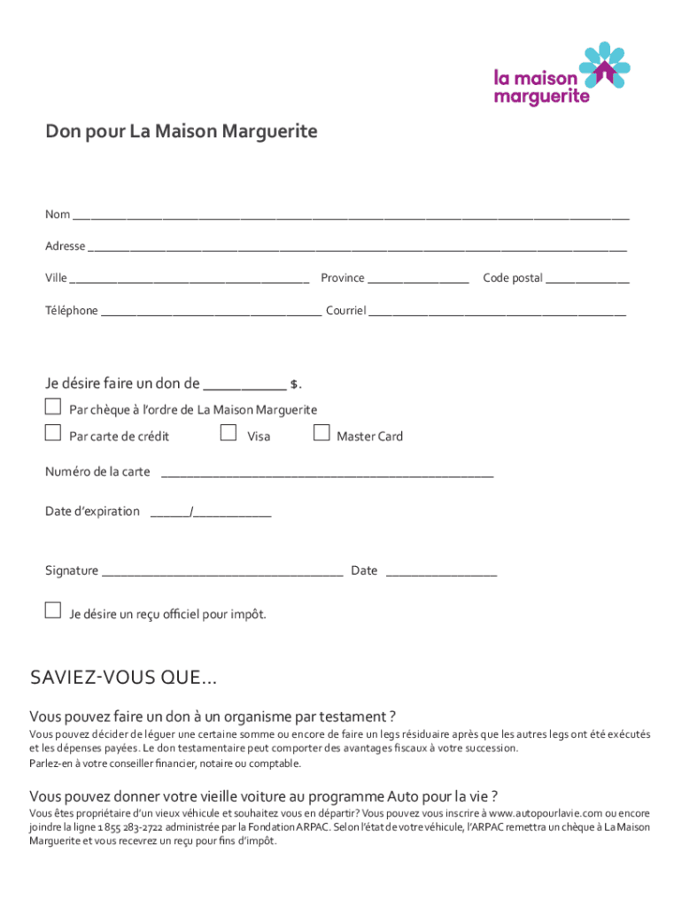 Le don pour la maison peut être rempli en ligne, en personne ou par courrier en suivant les instructions fournies par l'organisation bénéficiaire.