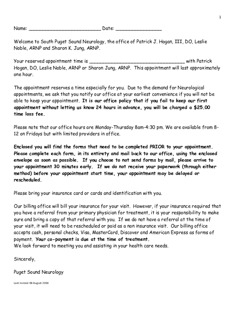 Get the free Welcome to South Puget Sound Neurology, the office of Patrick ...