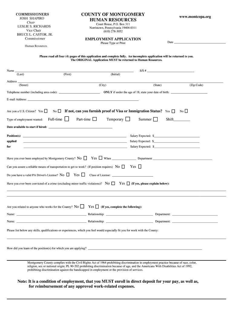 The Montgomery County Employment Application is a document used by job seekers to apply for employment with Montgomery County, Pennsylvania.