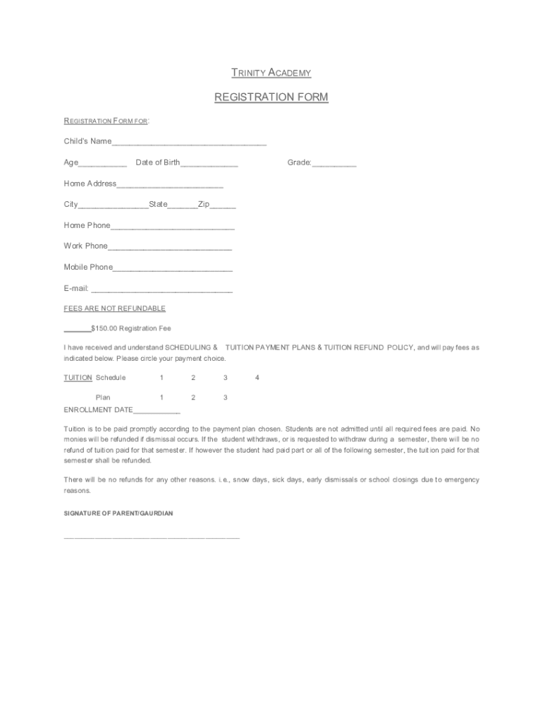 TRINITY ACADEMY REGISTRATION FORM FOR: Child's Name Age Date of Birth Grade: Home Address City State Zip Home Phone Work Phone Mobile Phone Email: FEES ARE NOT REFUNDABLE $150.00 Registration Fee