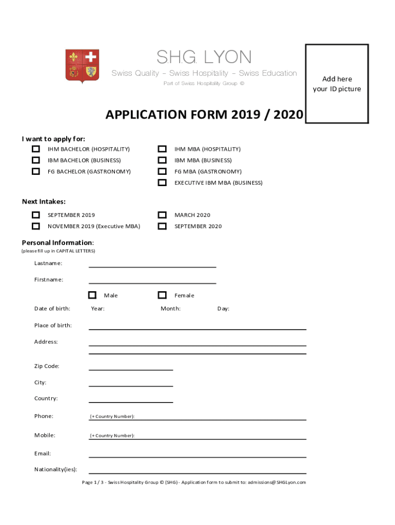 S.H.G. Lyonnais Quality Swiss Hospitality Swiss Education Part of Swiss Hospitality Group APPLICATION FORM 2019 / 2020 I want to apply for: IBM BACHELOR (HOSPITALITY)IBM MBA (HOSPITALITY)IBM BACHELOR
