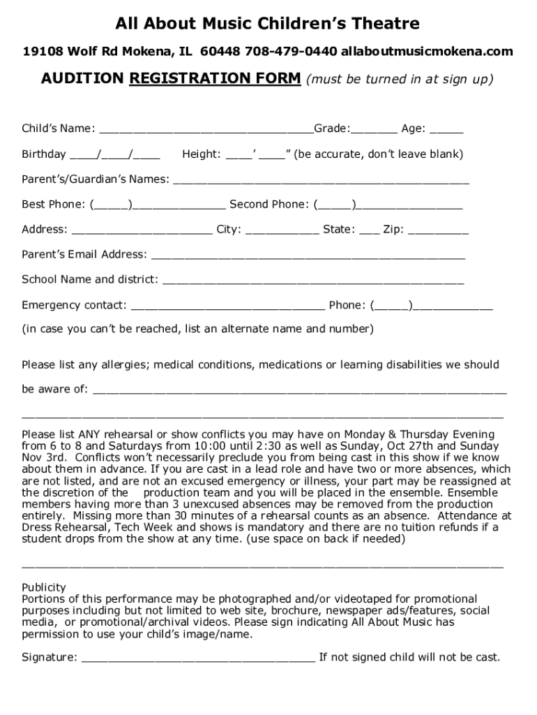 All About Music Children's Theater 19108 Wolf Rd Modena, IL 60448 7084790440 allaboutmusicmokena. Competition REGISTRATION FORM (must be turned in at sign up) Child's Name: Grade: Age: Birthday /