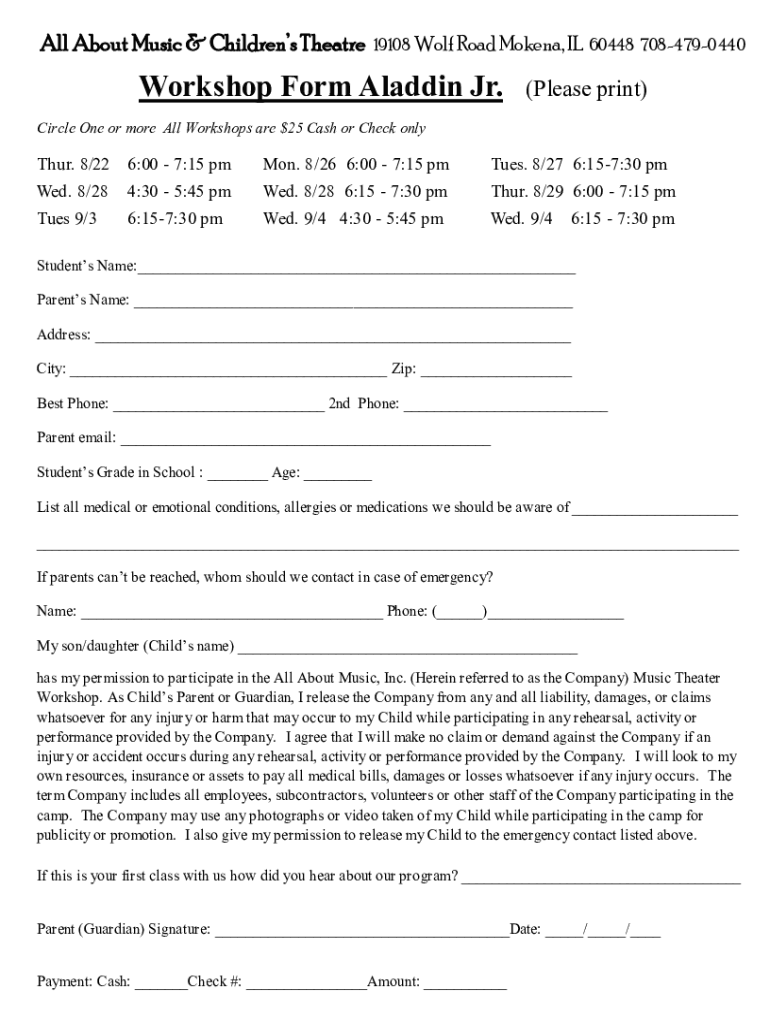 All About Music & Children's Theatre19108 Wolf Road Modena, IL 60448 7084790440Workshop Form Aladdin Jr.(Please print)Circle One or more All Workshops are $25 Cash or Check only Thur. 8/226:00 7:15