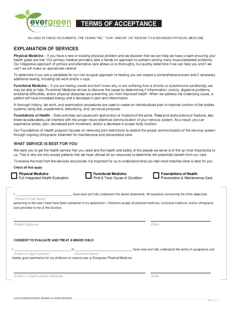 TERMS OF ACCEPTANCE AS USED IN THESE DOCUMENTS, THE TERMS WE, OUR AND/OR US REFERS TO EVERGREEN PHYSICAL MEDICINE.EXPLANATION OF SERVICES Physical Medicine If you have a new or existing physical problem,