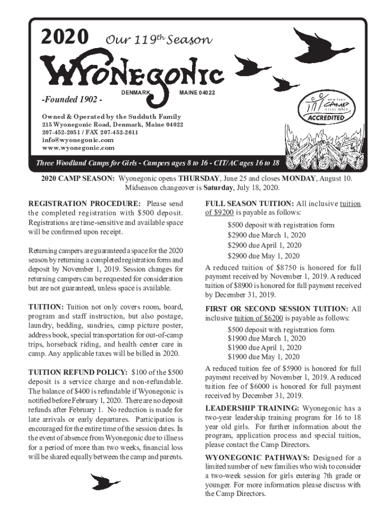 2020Our 119th SeasonFounded 1902 DENMARK, MAINE 04022Owned & Operated by the Suddath Family215 Wyonegonic Road, Denmark, Maine 04022 2074522051 / FAX 2074522611info wyonegonic.com www.wyonegonic.comThree