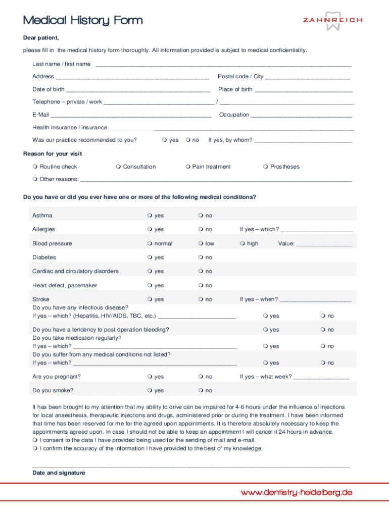 Medical History Form Dear patient, please fill in the medical history form thoroughly. All information provided is subject to medical confidentiality. Last name / first name Address Postal code /