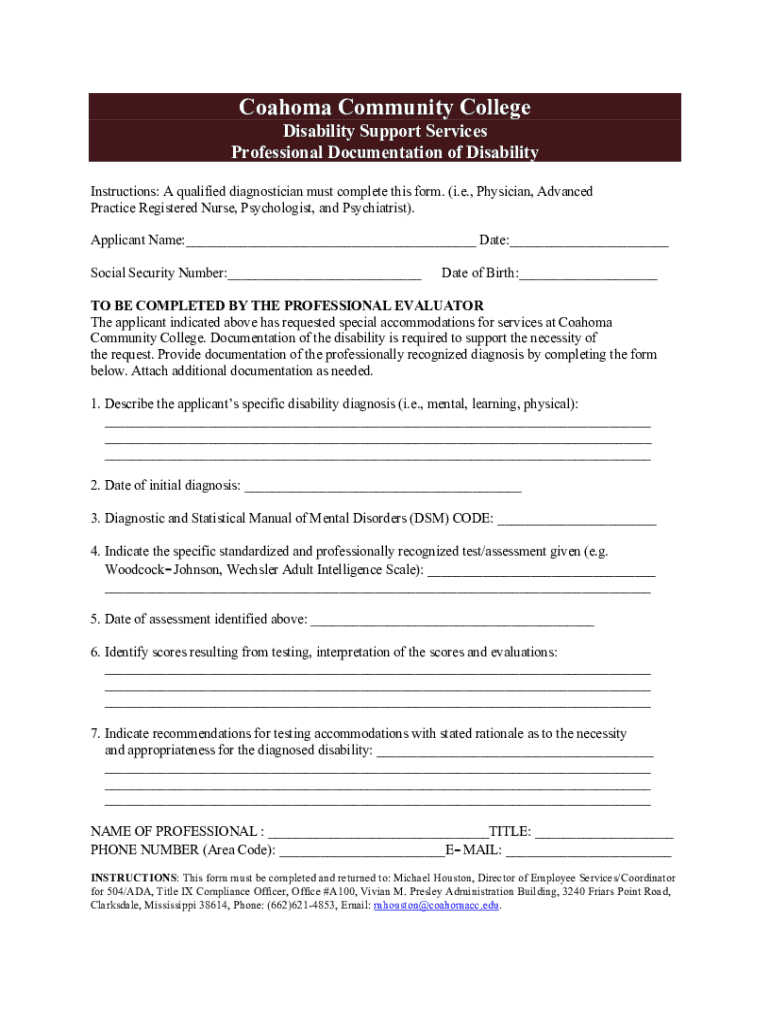 Coloma Community College Disability Support Services Professional Documentation of Disability Instructions: A qualified diagnostician must complete this form. (i.e., Physician, Advanced Practice Registered