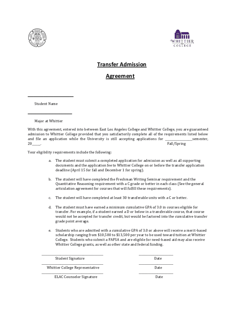 Transfer Admission Agreement Student Name Major at Whittier With this agreement, entered into between East Los Angeles College and Whittier College, you are guaranteed admission to Whittier College