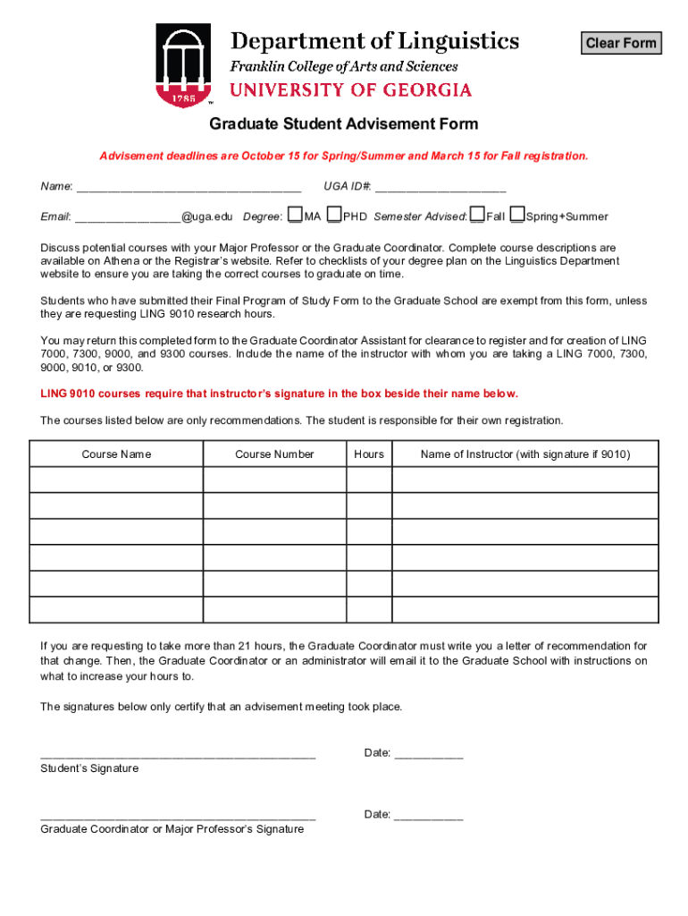 Clear Postgraduate Student Advisement Form Advisement deadlines are October 15 for Spring/Summer and March 15 for Fall registration. Name: UGA ID#: Email: UGA.edu Degree: MA PhD Semester Advised: