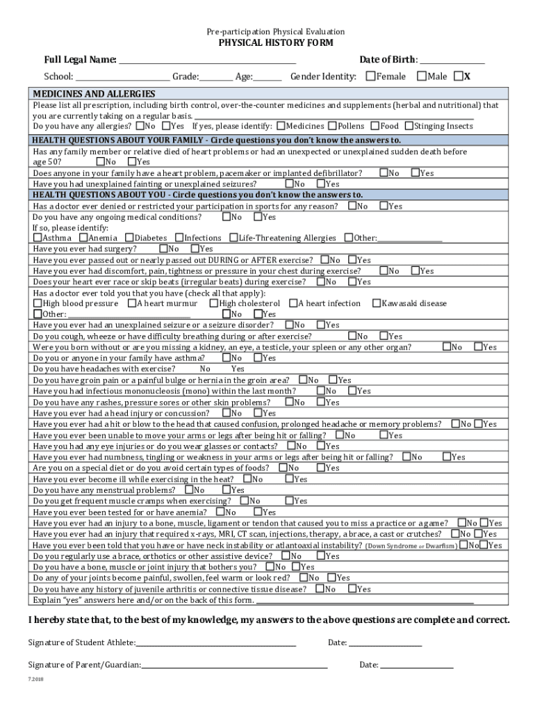 Participation Physical EvaluationPHYSICAL HISTORY FORM Full Legal Name: School:Date of Birth: Grade:Age:Gender Identity:FemaleMaleXMEDICINES AND ALLERGIES Please list all prescription, including birth