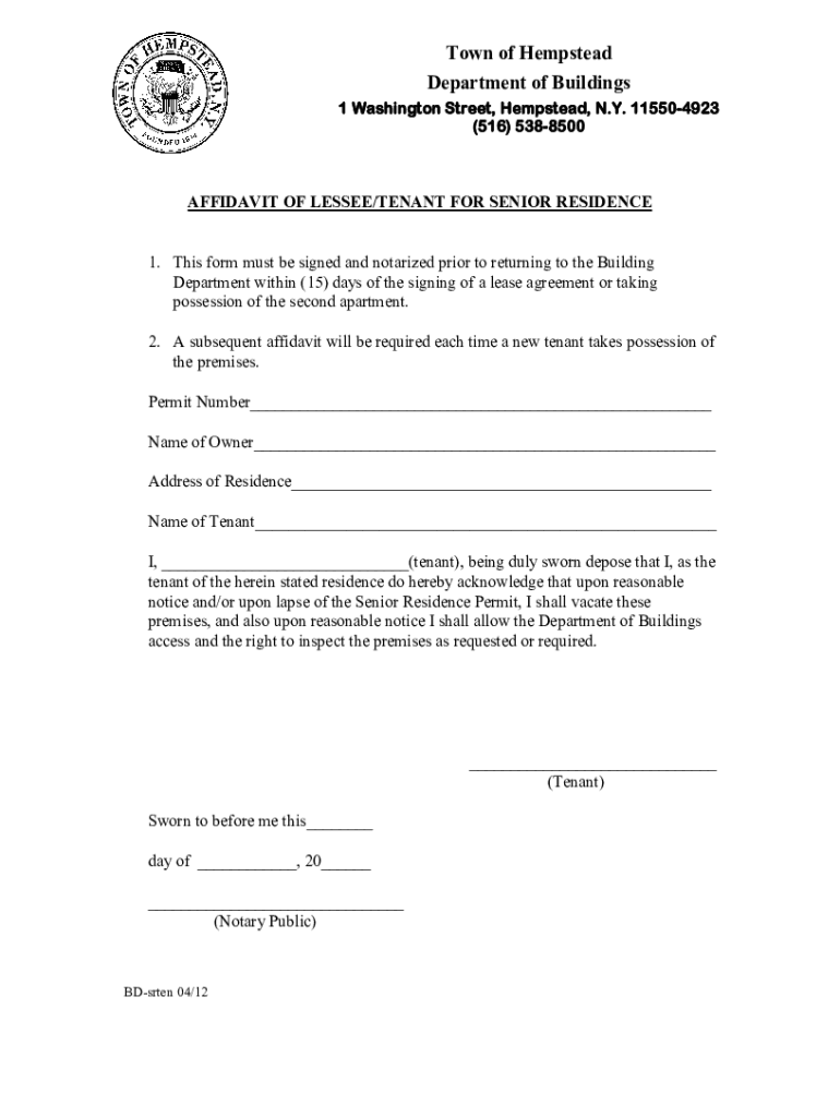 Town of Hempstead Department of Buildings 1 Washington Street, Hempstead, N.Y. 115504923 (516) 5388500AFFIDAVIT OF LESSEE/TENANT FOR SENIOR RESIDENCE 1. This form must be signed and notarized prior