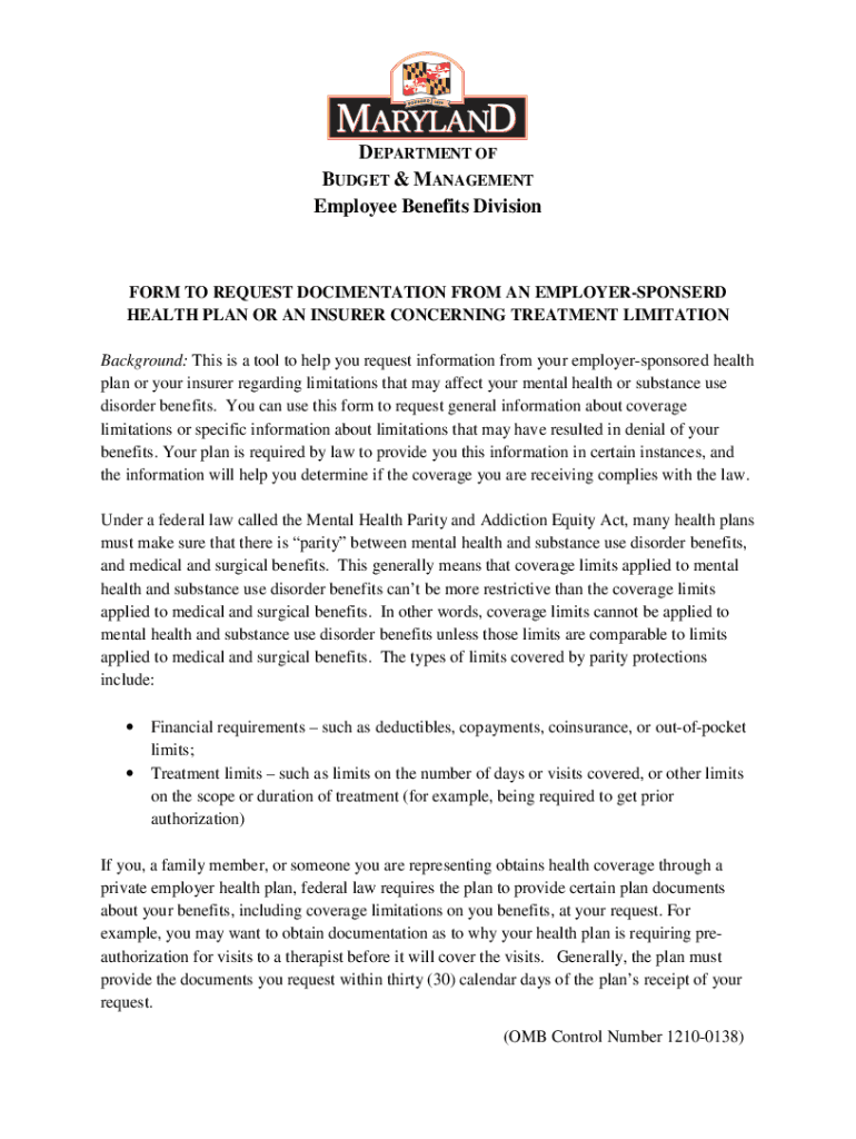 DEPARTMENT OF BUDGET & MANAGEMENT Employee Benefits DivisionFORM TO REQUEST DOCUMENTATION FROM AN EMPLOYERSPONSERD HEALTH PLAN OR AN INSURER CONCERNING TREATMENT LIMITATION Background: This is a tool