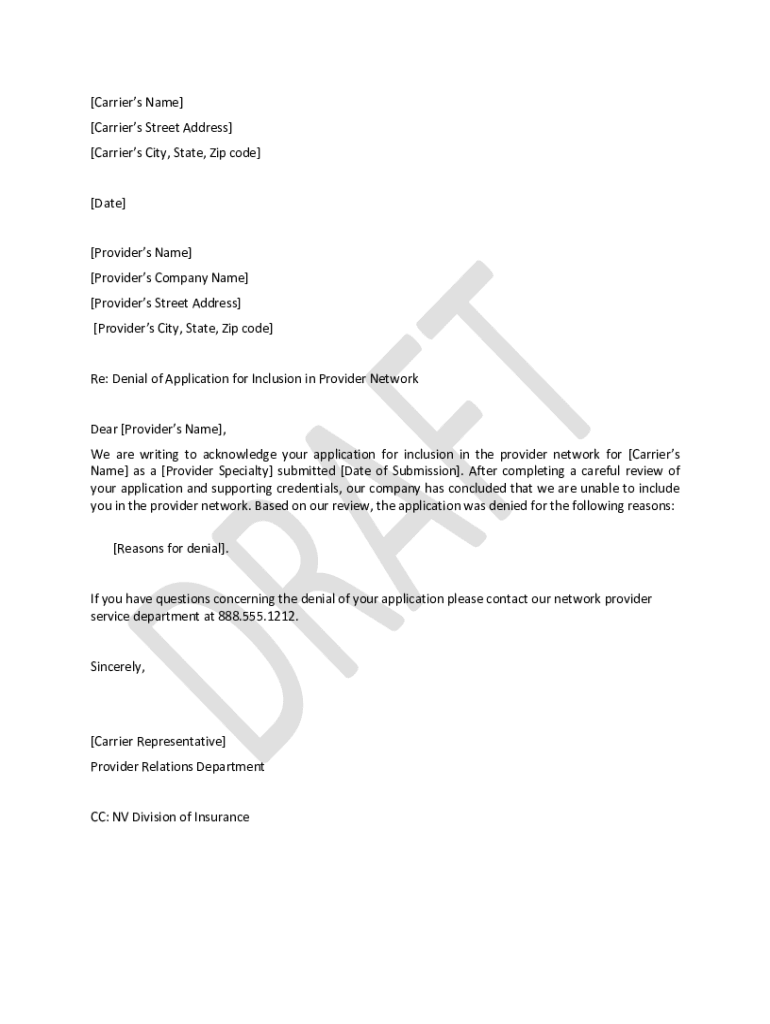 Carriers Name Carriers Street Address Carriers City, State, Zip code Date Providers Name Providers Company Name Providers Street Address Providers City, State, Zip code Re: Denial of Application for