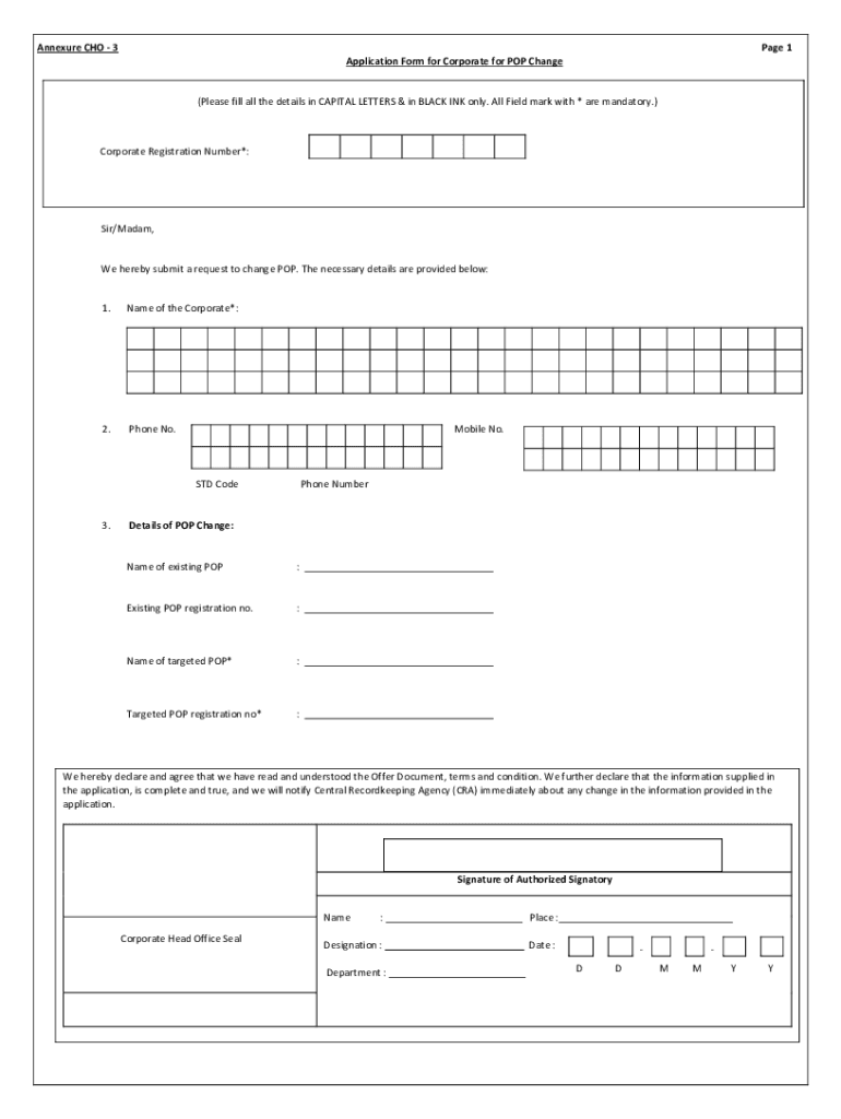 Appendix CHO 3Page 1 Application Form for Corporate for POP Change(Please fill all the details in CAPITAL LETTERS & in BLACK INK only. All Field mark with * are mandatory.) Corporate Registration