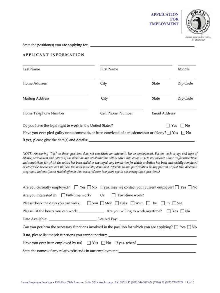 The Employment Application Form is a document used by Swan Employer Services to collect detailed information from job applicants in Anchorage, Alaska.