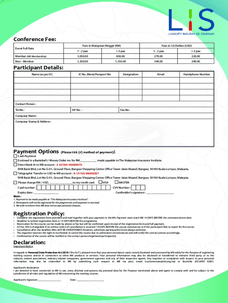 Conference Fee: Event Full Ratifies in Malaysian Ringgit (RM)Fees in US Dollars (USD)1 2 pax 3 pax1 2 pax 3 member (MID Membership)1,050.00850.00270.00220.00Non Member1,350.001,150.00340.00290.00Participant