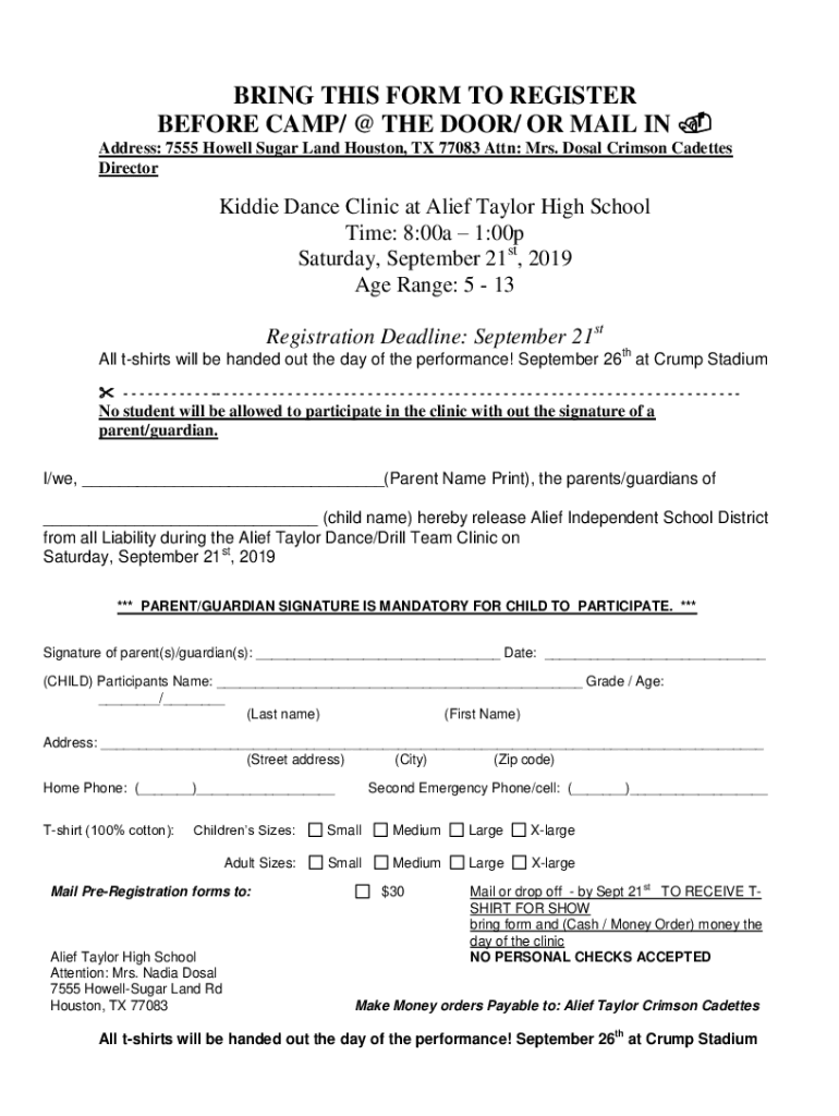BRING THIS FORM TO REGISTER BEFORE CAMP/ THE DOOR/ OR MAIL IN Address: 7555 Howell Sugar Land Houston, TX 77083 Attn: Mrs. Dorsal Crimson Cadette's DirectorKiddie Dance Clinic at Alien Taylor High